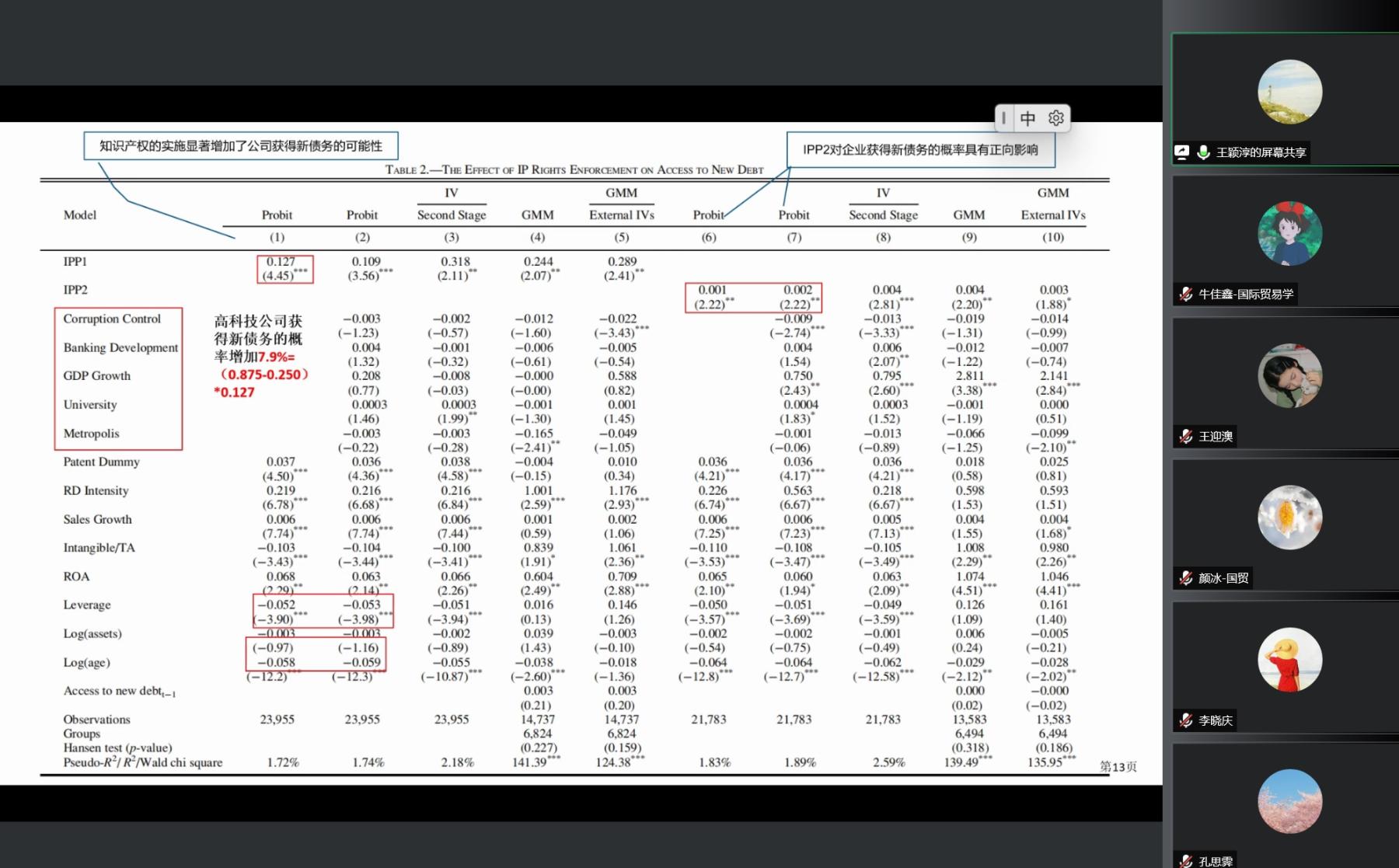 首先,王颖淳分享了由James S.AngYingmei Cheng,吴超鹏发表在The Review of Economics and Statistics上的“Does Enforcement of Intellectual Property Rights Matter in China? Evidence from Financing and Investment Choices in the High-Tech Industry?”一文。这篇文章通过考察同一国家不同省份的知识产权执法情况,发现知识产权执法在中国确实很重要:在知识产权保护力度较强的省份,高科技企业有更多机会获得外债融资,他们在研发上投入了更多资金,取得了更好的实际成果——更多的专利和新产品的销售。可见,知识产权的实施可以通过研发融资和研发投资的渠道促进经济增长。这篇文章有两个值得学习的地方:(1)两个衡量知识产权保护的指标,IPP1:2001-20057668件案件,知识产权侵权案件胜诉比率——执法效率。IPP2:2001-200528个省市的党报中含知识产权保护关键词的文章数量——官员对知识产权执法的态度。(2)工具变量选取了很少使用的历史变量。期间,王颖淳同学设置多个互动环节,引导参会同学们思考,整体讲解思路清晰。