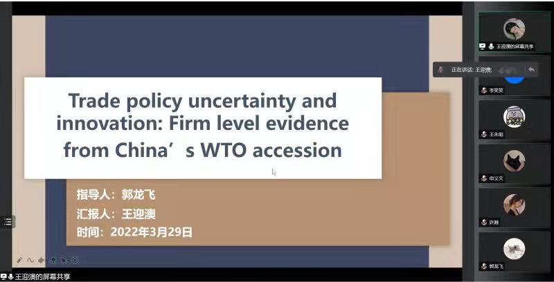 首先汇报的是21级国际贸易学专业王迎澳同学,她选取文章是由中国人民大学刘青教授和清华大学马弘副教授发表在Journal of International EconomicsTrade policy uncertainty and innovation: Firm level evidence from China’s WTO accession (贸易政策的不确定性与创新:来自中国加入WTO后企业层面的证据)。这篇文章提出了一种新的思路,贸易自由化可以通过减少目的地市场的贸易政策不确定性(TPU)来诱导创新。为了验证这种联系,作者将2001年中国加入世界贸易组织(WTO)导致的TPU大幅减少作为准自然实验。结果表明,TPU的减少显著鼓励了企业的专利申请:在中国加入WTO后,不确定性降低较大的行业中的企业提交了更多的发明专利申请。文章还发现,企业对TPU减少的创新反应因生产率、所有权、出口状况和投资的不可逆性而不同。