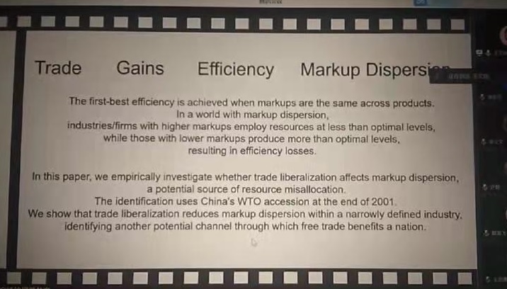 第二位汇报的是21级世界经济专业王文姝同学。她选取了2015年由陆毅教授和余林徽教授发表在American Economic Journal: Applied Economics上的文章Trade Liberalization and Markup Dispersion: Evidence from China’s WTO Accession(贸易自由化与加成率的离散程度:来自中国加入WTO后企业层面的证据)。这篇文章讲述了其如何用双重差分法和1998-2005年间的中国工业企业数据研究中国加入WTO所带来的贸易自由化对加成率离散程度的影响,发现在某些行业,贸易自由化使得不同企业的加成率趋于一致,由此证明了自由贸易的另一个好处,即通过影响加成率来提高经济效率。除文章内容之外,王文姝同学还重点介绍了企业加成率的估计方法(DLW方法)。加成率定义为产品价格对边际成本的偏离,其大小可以用来度量企业的市场势力和贸易利得。通过构造拉格朗日方程,以固定产量为约束条件,求解能使成本最小的中间品要素投入量,可以得到加成率与投入要素产出弹性以及要素成本在总收入中占比的关系,而后用超越对数形式的生产函数求解投入要素产出弹性,即可估算加成率的数值。