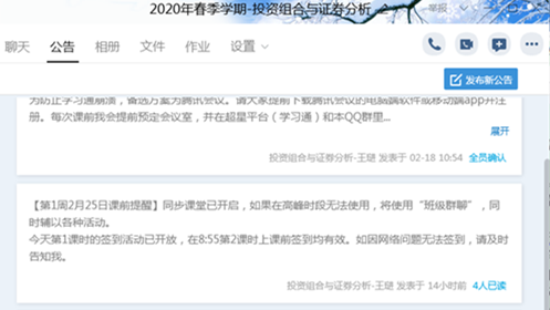 2月25日早晨8:00,beats365金融学系讲师王琎本学期承担的研究生必修课《投资组合与证券分析》准时开课,需要指出的是在网络授课高峰期,王琎老师成功地抢占了同步课堂资源,进行了一次理想状态的运用平台推荐的授课方式授课,用学习通与员工们互动交流,而且全程下来,音频没有间断,同步直播一直在线。