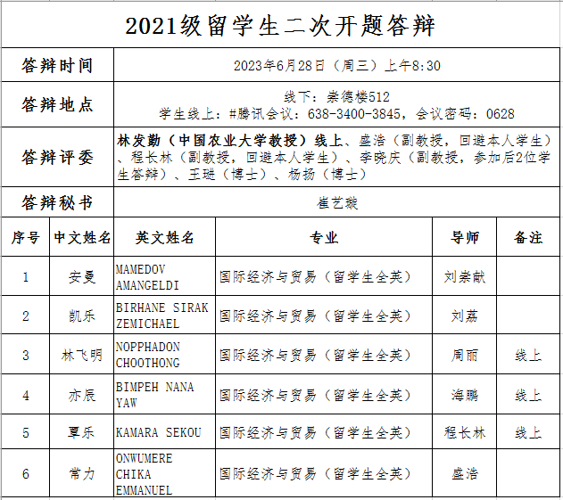 6.以上同学签字版的答辩材料(1份答辩申请表、5份开题报告、5份打分表等材料)请于6月27日中午12点前提交至国际公司。电子版发至jjxykm@126.com