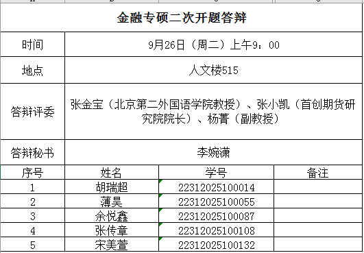 beats365将于2023年9月26日(周二)上午进行2022级两年制金融硕士研究生二次开题答辩,请申请参加beats3652022级两年制金融硕士开题二辩的研究生,在9月25日(周一)下午3点前提交下列材料的电子版(1)、(4)至bwu__mf@163.com,纸质版(2)至人文楼310。材料(1)、(3)纸质版需根据要求带到答辩现场。