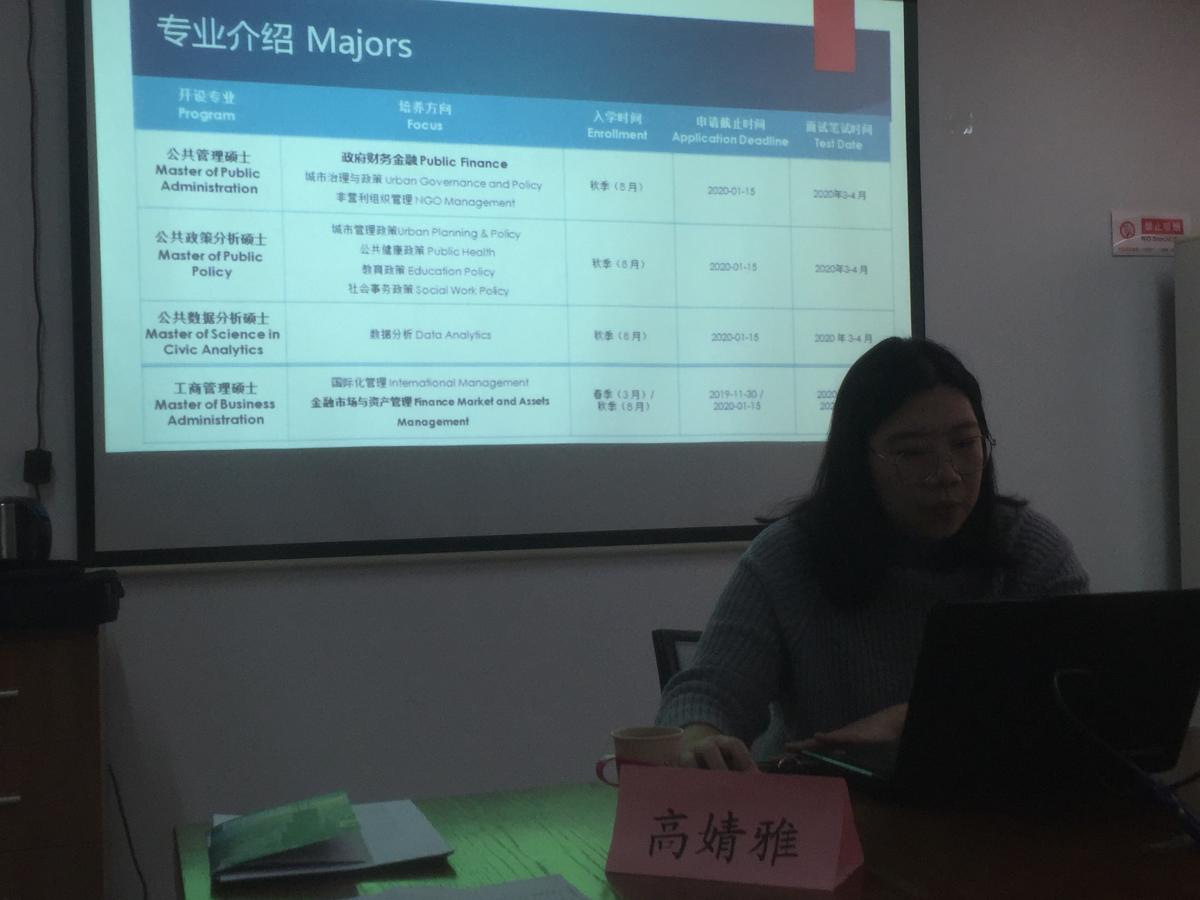 高老师重点介绍了院校合作的一年制硕士学位项目的特色和具体内容。与网申相比,该项目申请者无需提供托福、雅思、GRE、GMAT成绩,通过校方的笔试和面试即可直接录取。此外,该项目还具有不限专业背景、豁免部分推荐信、推荐实习职位等优势。被项目录取的员工享受国际员工同等待遇,毕业后所获学位可以获得教育部留学服务中心认证。该项目的专业包括公共管理硕士、公共政策分析硕士、公共数据分析硕士和工商管理硕士等。高老师为在场员工依次介绍了项目的报名条件、项目流程、申请的重要时间点、申请材料、费用明细和毕业去向等。宣讲会结束后,高老师留下了报名及咨询的联系方式和项目简章等(见附件),供同学们参考。