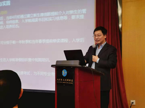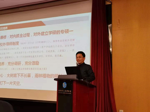 第二个发言的是首届青年长江学者、2018年教育部“长江学者奖励计划”特聘教授、对外经济贸易大学研究生院经理吴卫星教授,他就“金融公司金融专硕人才培养”问题与大家进行经验交流,主要从教学计划与课程设置、双导师制、提前培养的探索与实践、狠抓学位论文质量、职业规划与系列讲座等几个方面来谈构建全面的人才培养模式;接着讲到要顺应需求,选准定位,不断创新金融专硕项目,以量化投资专硕项目为例,介绍了讨论班和兴趣班组织、模拟面试和职场培训方面进行产学研一体化培养探索的经验;最后是落实国家“双创”政策,实现优质就业,并介绍了该校专硕员工的就业工作情况。