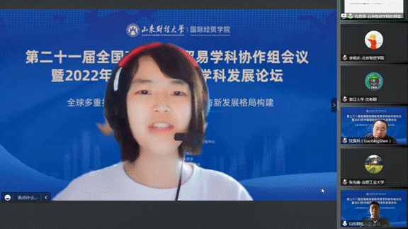 2022年11月25日至27日,第21届全国高校国际贸易学科协作组会议暨2022年中国国际贸易学科发展论坛在山东财经大学召开。本届会议通过线上方式进行,公司共有三篇论文入选:国际贸易学孔思霁同学与李晓庆老师合作的《外国知识产权保护、专利持有寿命与企业出口表现》、金融专硕张雪同学与王海军老师、王雅娴老师合作的《对外援助与碳排放:基于中国的经验》以及王海军老师的《援助促进了对外直接投资吗—基于国家法风险的视角》。公司研究生孔思霁同学和张雪同学在会上就前两篇文章做了汇报。