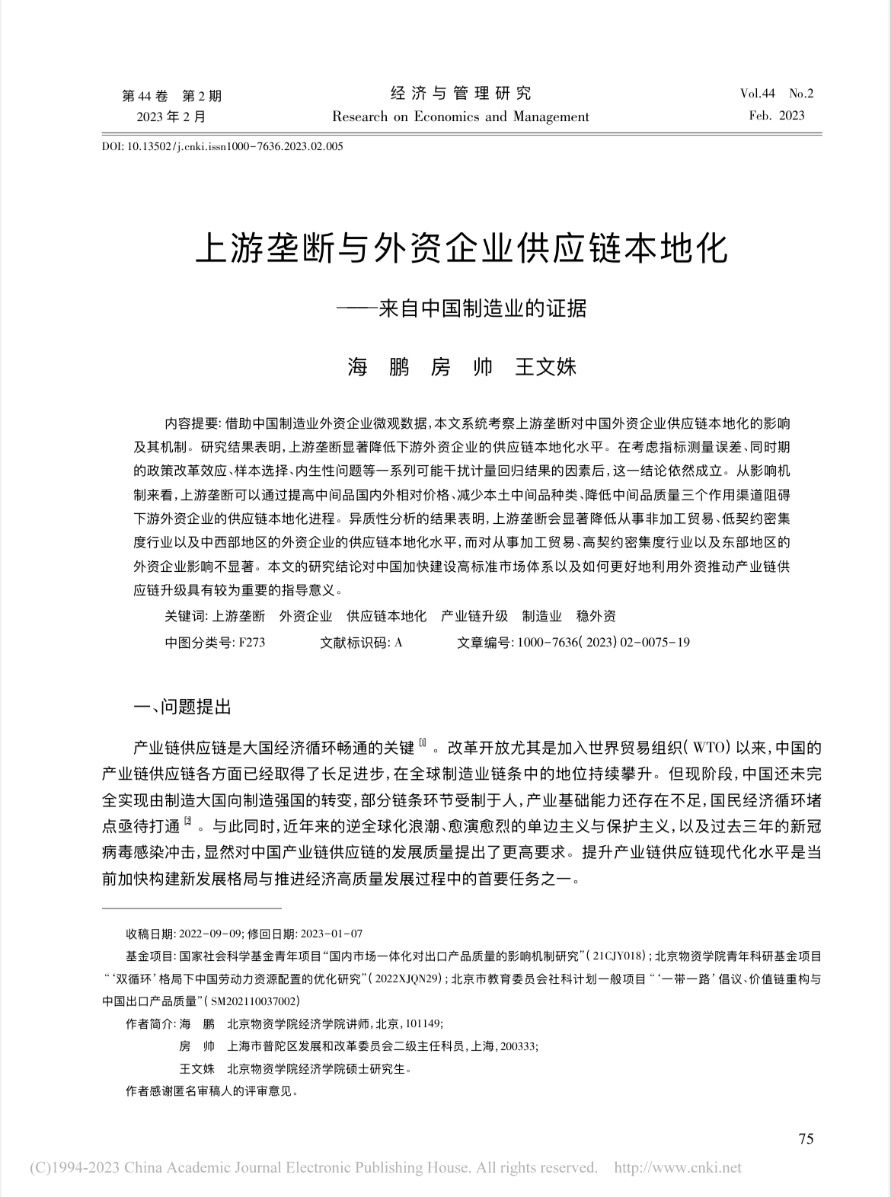 近日,公司2021级硕士研究生王文姝与国贸系海鹏老师合作论文《上游垄断与外资企业供应链本地化——来自中国制造业的证据》在《经济与管理研究》2023年第2期发表。《经济与管理研究》是国内经济管理领域的重要学术期刊,复合影响因子为6.54。