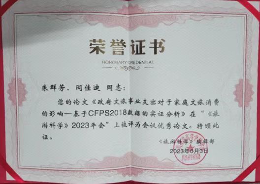 会后,经过会议主办单位评选,朱群芳老师及其研究生闵佳迪合作的《政府文旅事业支出对于家庭文旅消费的影响——基于CFPS2018数据的实证分析》荣获《旅游科学》2023年会优秀论文。