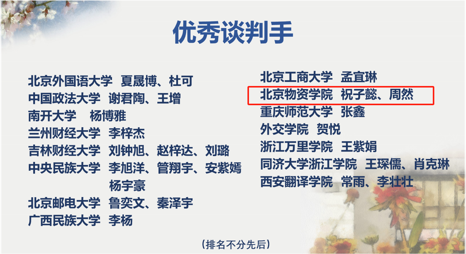 未来国际商务(中文)谈判精英全国赛的上级单位是中国管理现代化研究会,其由中国科学协会主管。国际商务谈判精英大赛已有18年历史共举办27届比赛(含本届),代表全国同类比赛的最高水准,是我国社团机构组织的高水平谈判类经典赛事,具有专业性、实战性和权威性。先后有几十所中外顶尖高校的上千名学子,经历了大赛的培养和锤炼,提高了商务谈判技能和实战能力,成为了活跃在国内外商务战线上的优秀人才。本次大赛于2023年7-11月间举行,参赛队伍来自国内18所知名高校的32支代表队,通过谈判案例文案方案策划比赛、网络晋级比赛和最终的总决赛,最终决出了各个奖项。