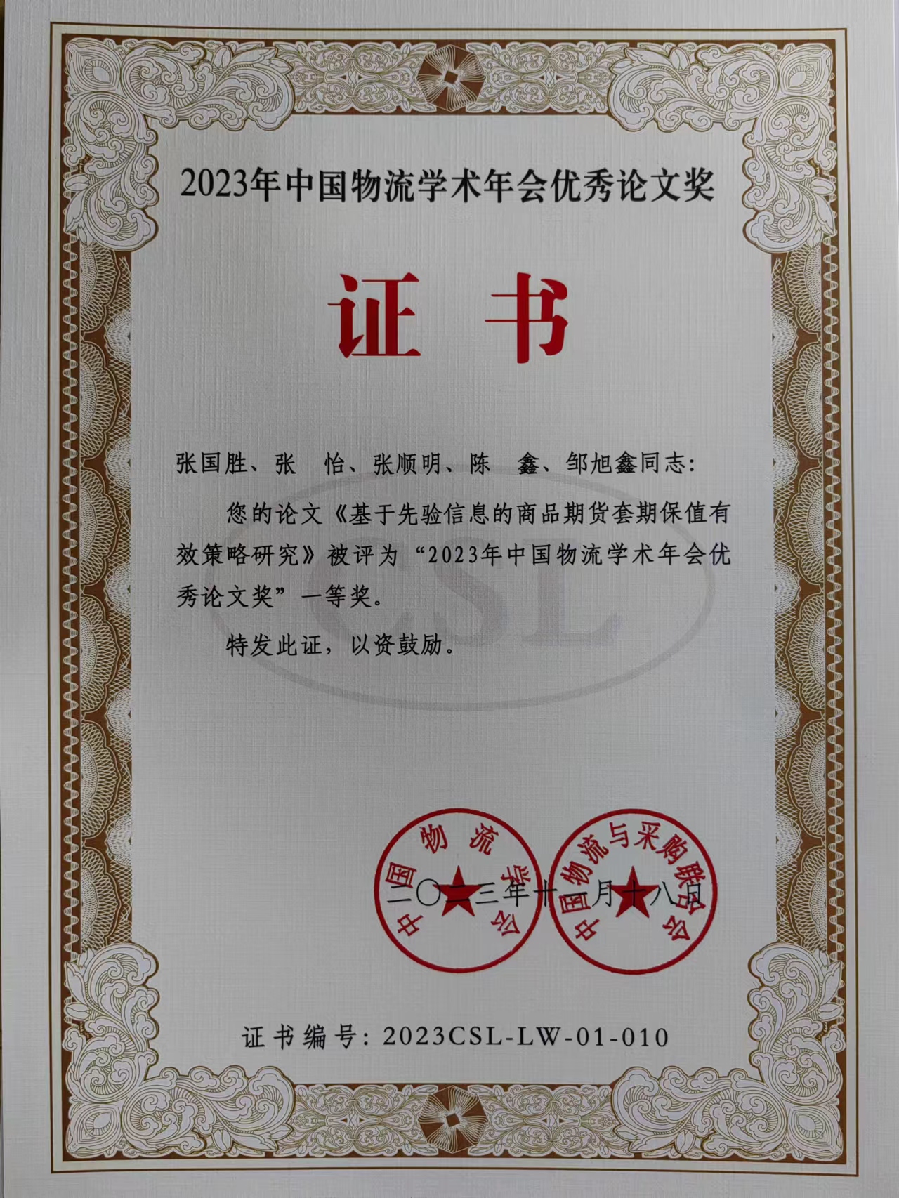 近日,由中国物流学会、中国物流与采购联合会主办的第二十二届中国物流学术年会在无锡举办。会议宣布了2023年中国物流学会优秀论文奖,公司beats365张国胜教授等提交的论文“基于先验信息的商品期货套期保值有效策略研究”,获优秀论文一等奖,特此祝贺!