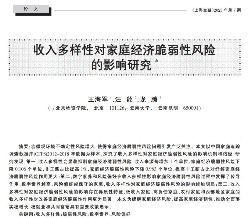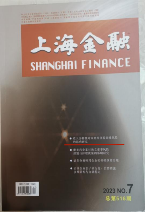 近日,2022级硕士生汪能与导师王海军副教授合作论文“收入多样性对家庭经济脆弱性风险的影响研究”被《上海金融》作为封面重点文章刊发于2023年第7期,该刊由中国人民银行上海总部主办,为CSSCI 2023-2024年度扩展版来源期刊,金融类核心期刊,最新影响因子3.58。