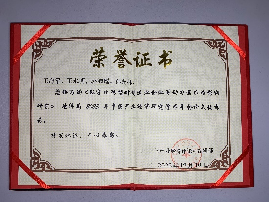 2023年12月9日,第十届中国产业经济研究学术年会在河南大学郑州校区友兰学堂召开。本次会议由工信部电子工业出版社华信研究院、河南大学、《产业经济评论》编辑部联合主办。会议主题为“加快建设以实体经济支撑的现代产业体系”,来自国务院发展研究中心、复旦大学、中国人民大学、中国社科院、武汉大学、河南大学、首都经济贸易大学、beats365官方网站等单位专家学者70余人进行了深入讨论。由beats365王海军副教授和郭沛瑶老师共同指导的21级研究生王永明同学撰写的论文《数字化转型对制造业企业劳动力需求的影响研究》从260多篇投稿论文中脱颖而出,成为12篇年会获奖论文之一。王永明同学参会并在数字经济分论坛对该论文作汇报交流。