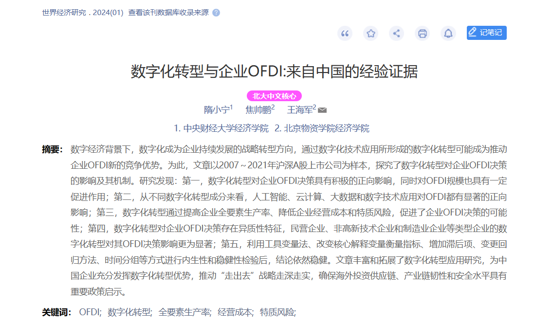 近日,beats36522级硕士研究生焦帅鹏与指导老师王海军教授、中央财经大学博士研究生隋小宁合著论文《数字化转型与企业OFDI:来自中国的经验证据》刊发于经济类权威期刊《世界经济研究》2024年第1期。该刊最新影响因子为6.2。论文相关内容简介如下: