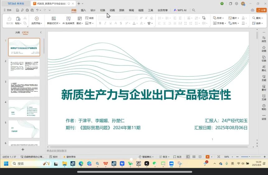 代如玉同学分享的是于津平、李媚媚和孙楚仁发表在《国际贸易问题》2024年第11期上的文章“新质生产力水平测算与企业出口产品稳定性”。主要根据2010—2016年中国微观企业数据库,实证检验了新质生产力对我国企业出口产品稳定性的影响。研究发现,新质生产力通过创新提升、成本削减、供应链优化三重效应,显著降低出口风险率,延长企业出口持续时间。