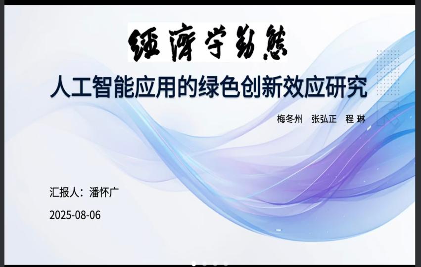 潘怀广同学分享的是梅冬州、张弘正和程琳发表在《经济学动态》2025年第6期上的文章“人工智能应用的绿色创新效应研究。文章基于2007—2022年中国A股制造业上市企业数据考察了人工智能应用对绿色创新的影响与机制。研究发现,人工智能应用显著推动了企业绿色创新“提质增量。进一步研究发现,人工智能应用有效提升了企业进行绿色创新的持续性并且抑制了企业的漂绿行为。