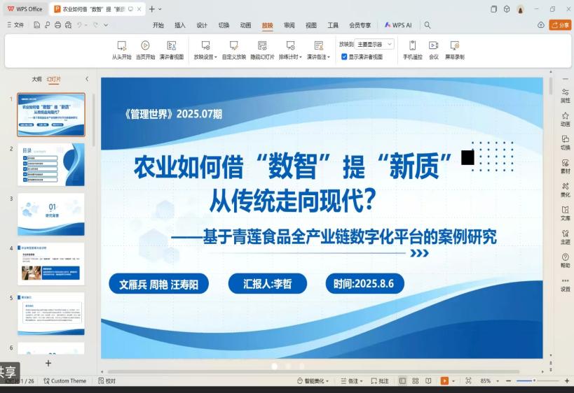 李哲同学分享的是文雁兵等发表在《管理世界》2025年第07期上的文章‘农业如何借“数智”提“新质”从传统走向现代?——基于青莲食品全产业链数字化平台的案例研究’。文章基于青莲食品全产业链数字化平台案例,采用“动因—过程—结果”分析框架,剖析传统农业转型“现代化需求驱动→数智化发展过程→新质生产力结果”的内在形成机制和构建传统农业现代化转型的全新理论框架。研究发现,农业现代化转型、企业数智化发展、新质生产力形成的同步演进能够推动传统农业借“数智”提“新质”走向现代农业和未来农业。